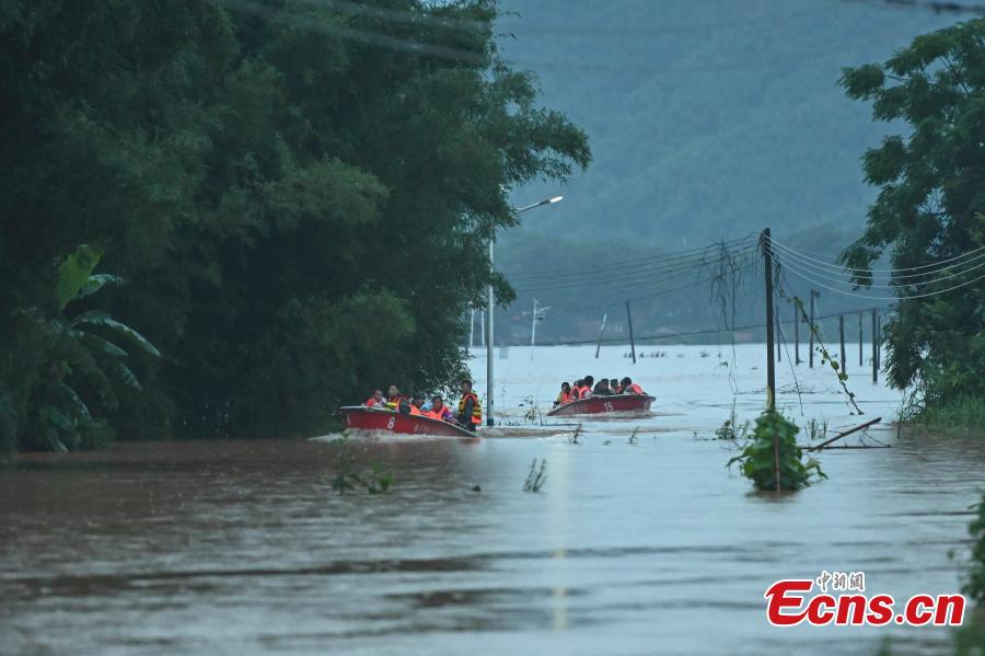 Rescue personnel evacuate trapped people during a major flood in Shaoguan, south China's Guangdong Province, June 21, 2022. (Photo: China News Service/Chen Jimin)