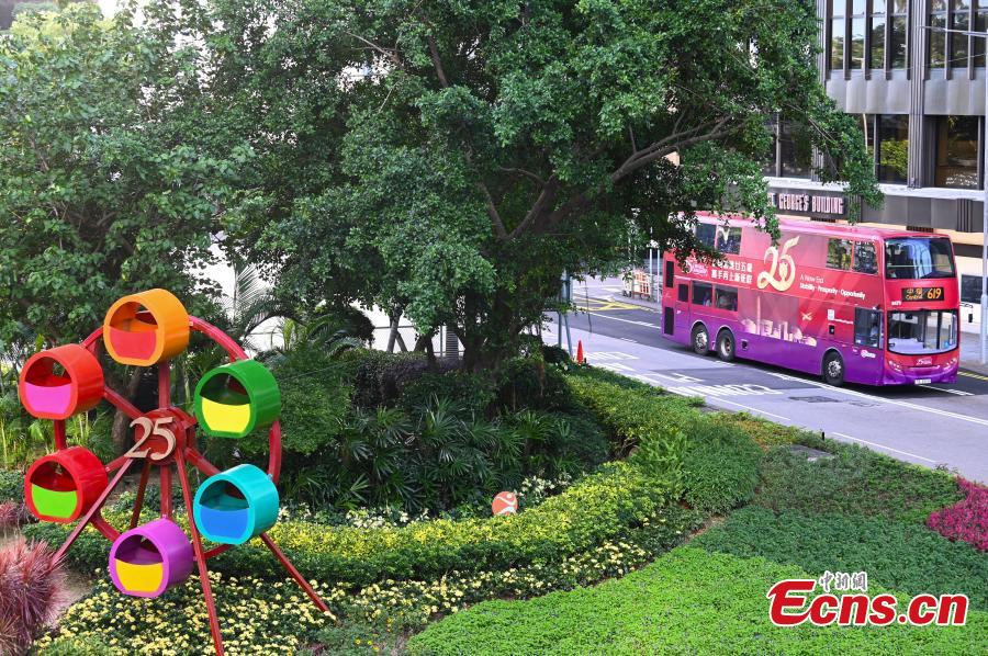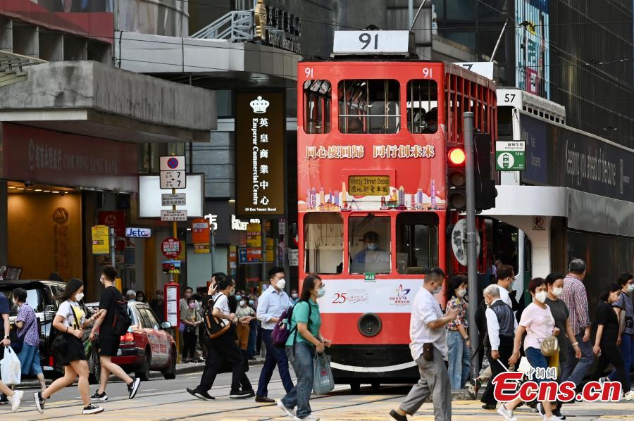 A double-decker buscovered with celebratory decoration runs on the street in the Hong Kong Special Administrative Region, June 23, 2022. This year marks the 25th anniversary of Hong Kong's return to the motherland. (Photo: China News Service/Li Zhihua)