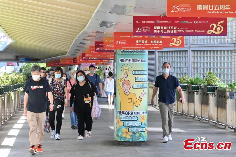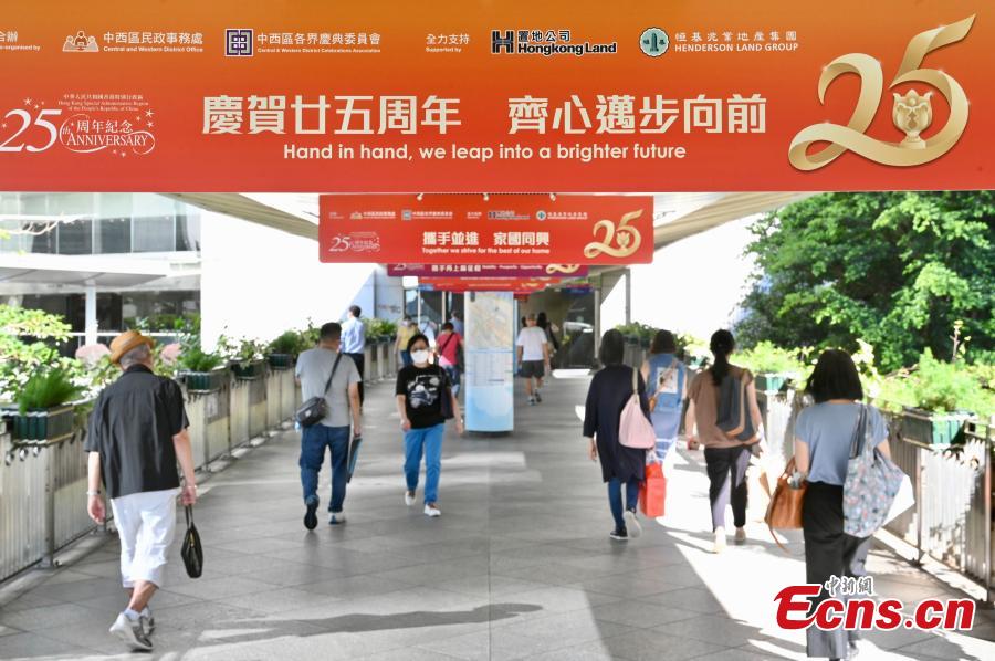 Celebratory posters marking the 25th anniversary of Hong Kong's return to the motherland are hung on an overbridge in the Hong Kong Special Administrative Region, June 23, 2022. This year marks the 25th anniversary of Hong Kong's return to the motherland. (Photo: China News Service/Li Zhihua)