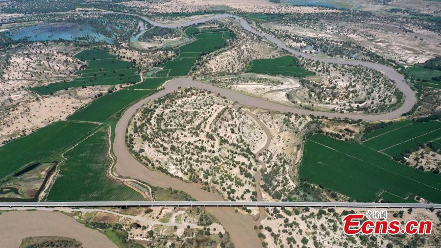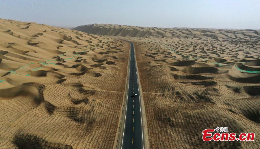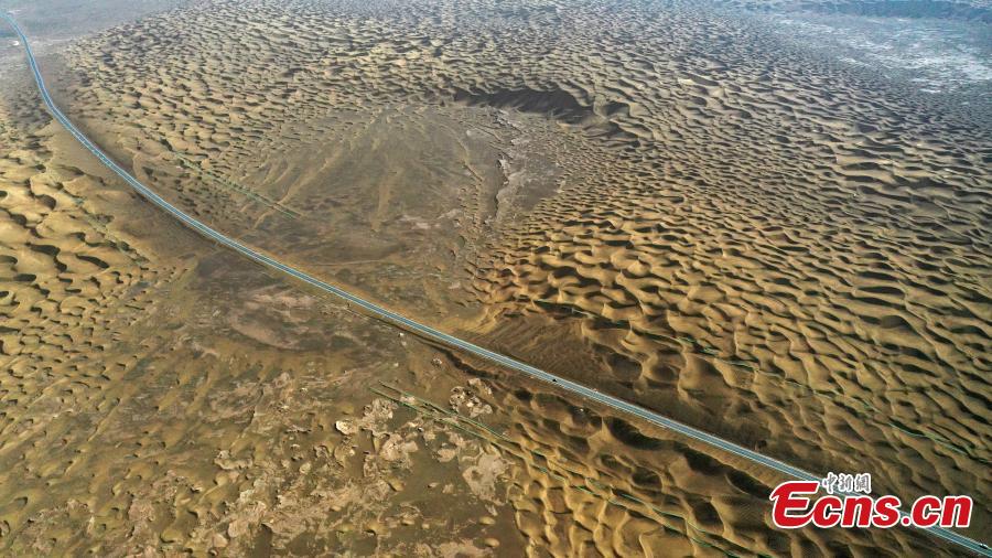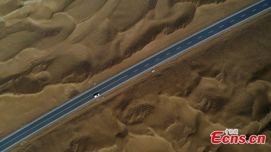 Aerial photo shows the Yuqie desert highway, expected to open to the traffic on June 30, 2022, in northwest China's Xinjiang Uyghur Autonomous Region, June 26, 2022. (Photo provided to China News Service)