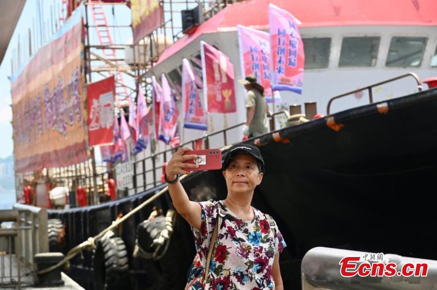 A fishing vessel hanging the Chinese national flags, the Hong Kong Special Administrative Region (HKSAR) flags and celebratory posters moors at the Victoria Harbor in the Hong Kong Special Administrative Region, June 28, 2022. (Photo: China News Service/Li Zhihua)