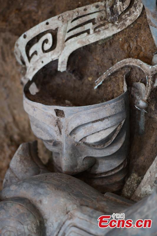 A bronze mythical creature is discovered from the No. 8 sacrificial pit at the Sanxingdui Ruins site in Guanghan, southwest China's Sichuan Province on June 28, 2022. (Photo: China News Service/Zhang Lang)