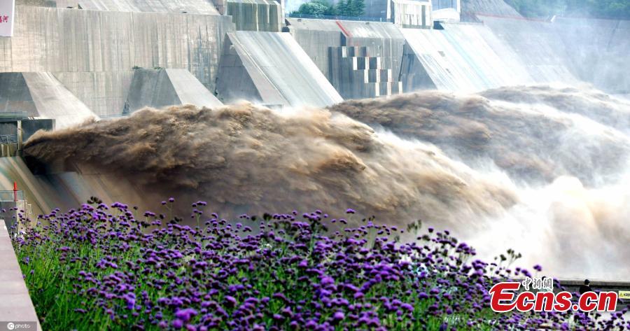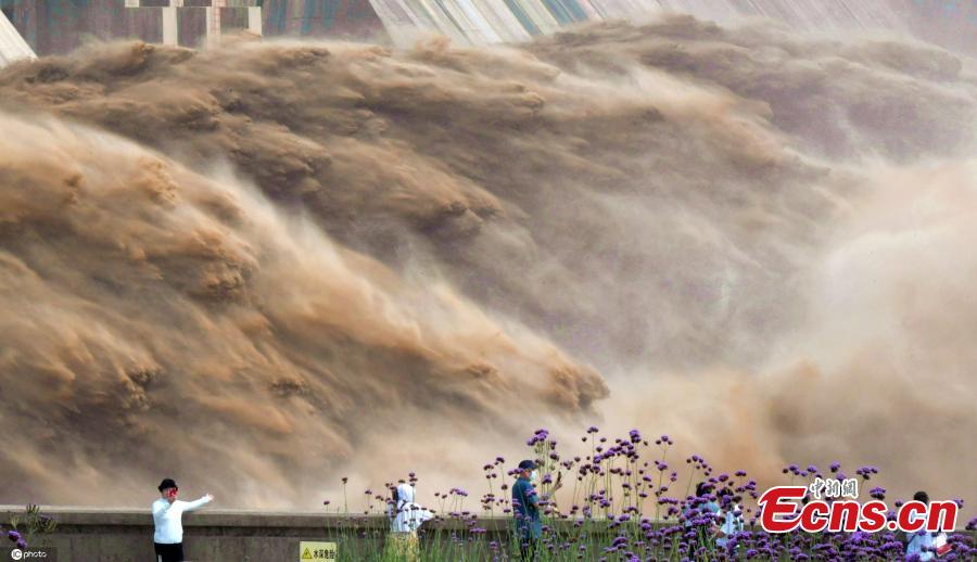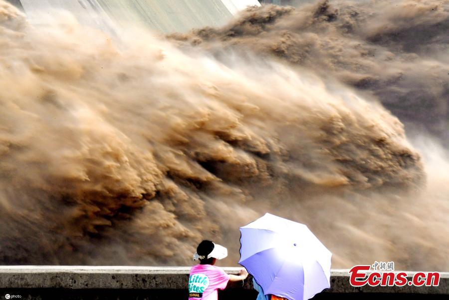 Tourists watch water gushing out from the Xiaolangdi Reservoir on the Yellow River during a sand-discharging operation in Luoyang, central China's Henan Province, July 4, 2022. (Photo/ICphoto)