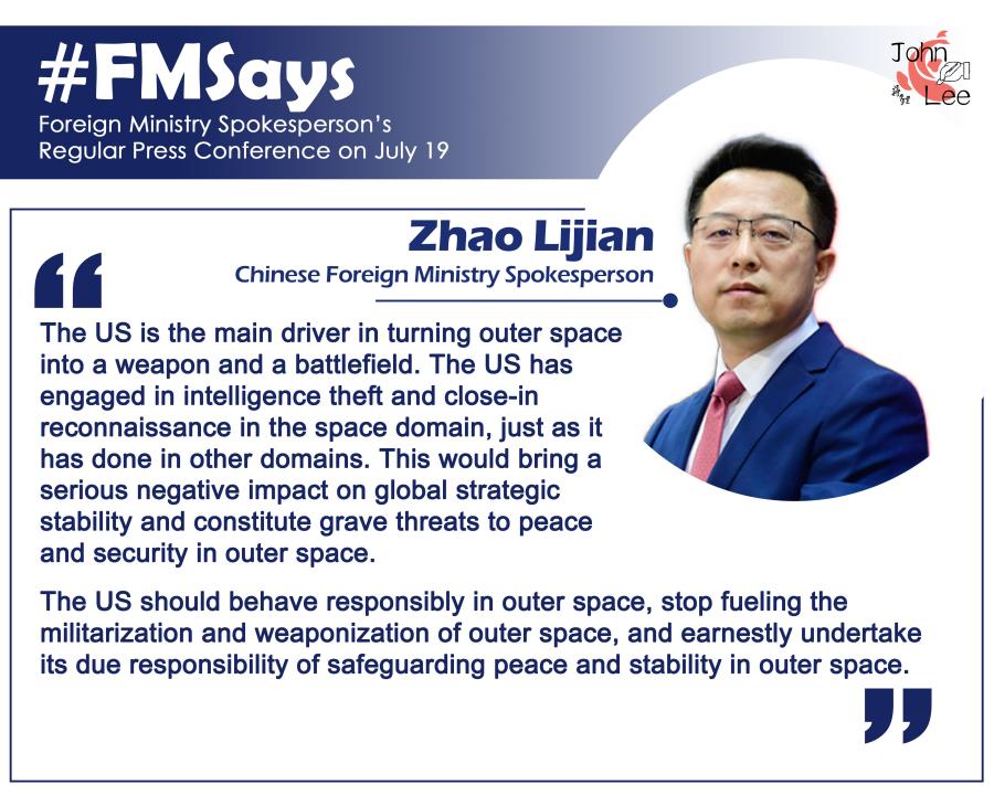 China urges U.S. to stop fueling militarization and weaponization of outer space