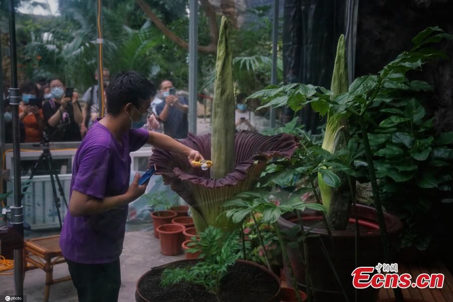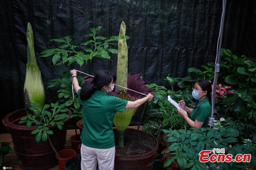 Staff members of the National Botanical Garden measure the blooming Titan Arum plant (Amorphophallus titanum) at the garden in Beijing, July 19, 2022. (Photo/ICphoto)