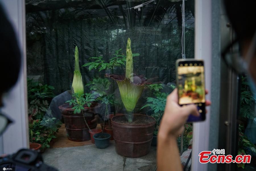 Visitors take photos of the blooming Corpse Flower during a night event at the National Botanical Garden in Beijing, July 19, 2022. (Photo/ICphoto)