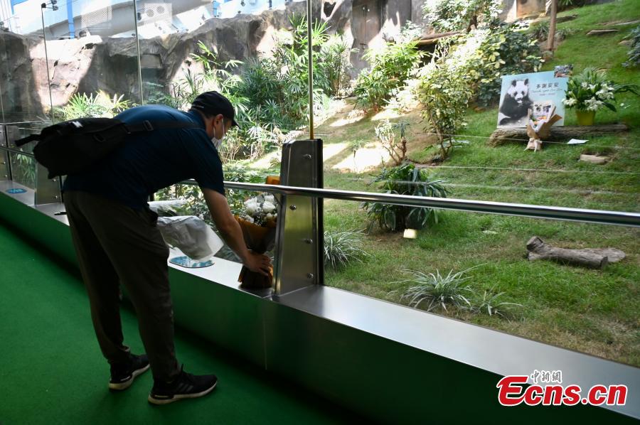 A visitor presents flowers to mourn giant panda An An at Ocean Park, the Hong Kong Special Administrative Region, July 21, 2022. (Photo: China News Service/Li Zhihua)