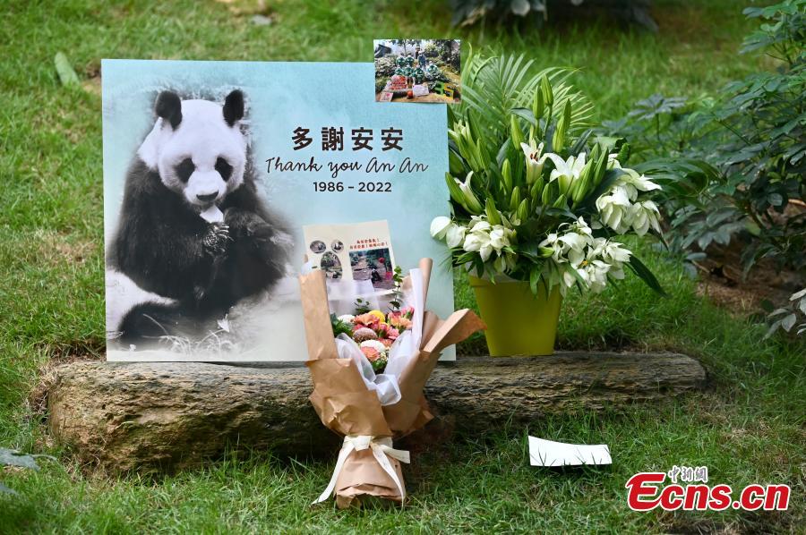 Flowers are presented to mourn the giant panda An An at Ocean Park, the Hong Kong Special Administrative Region, July 21, 2022. An An, the world's longest-living male giant panda under human care, died aged 35 on Thursday morning in its home at Ocean Park. (Photo: China News Service/Li Zhihua)