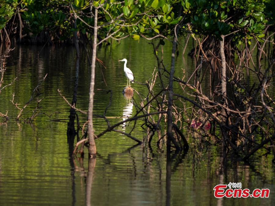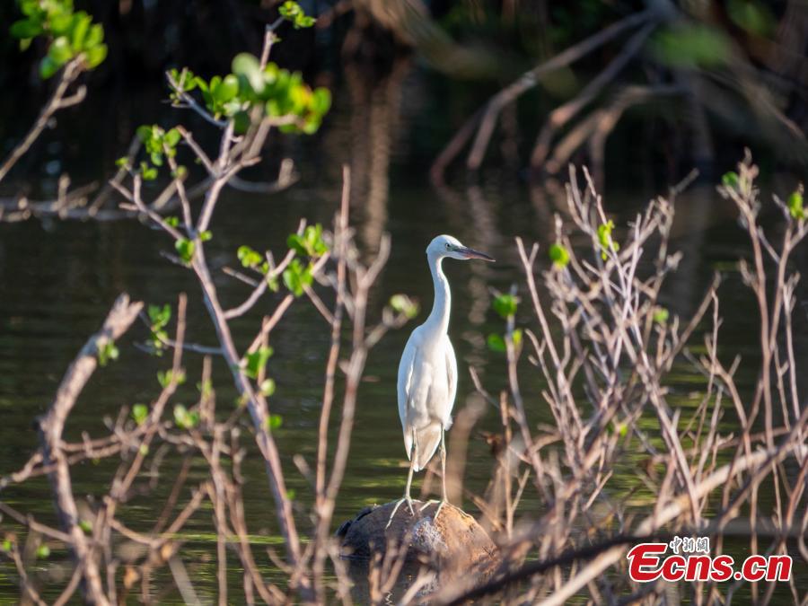 An egret perches on the top of a rock in the mangrove forest in Xinying town of Lingao county, south China's Hainan Province, July 24, 2022 (Photo: China News Service/Ling Nan).