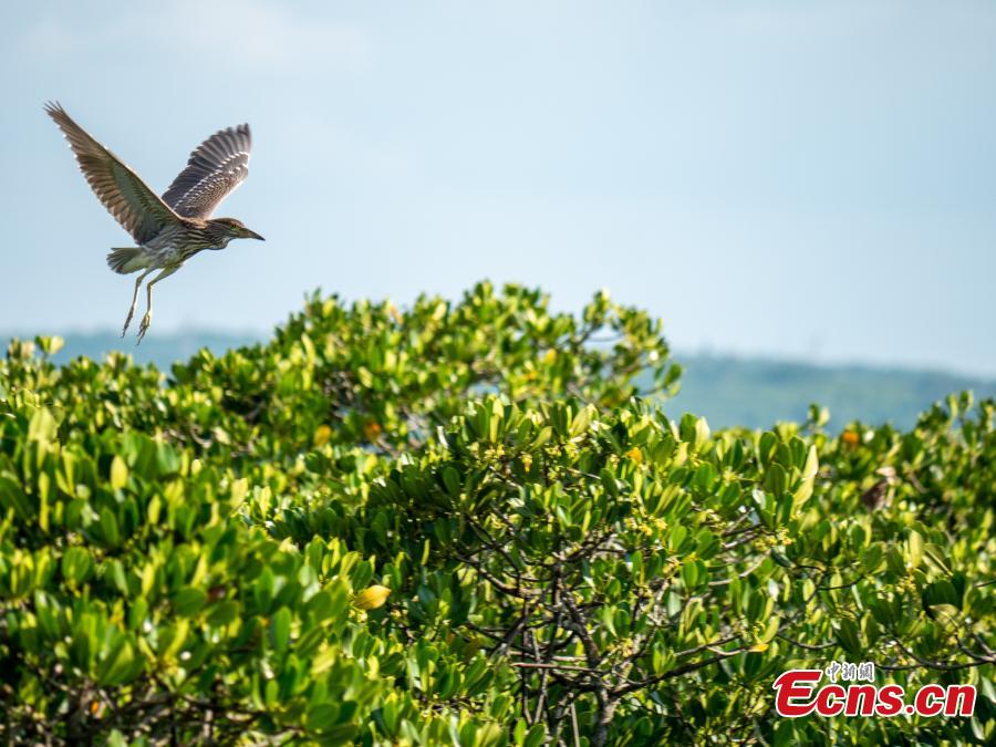 A heron flies over mangrove trees in Xinying town of Lingao county, south China's Hainan Province, July 24, 2022 (Photo: China News Service/Ling Nan).