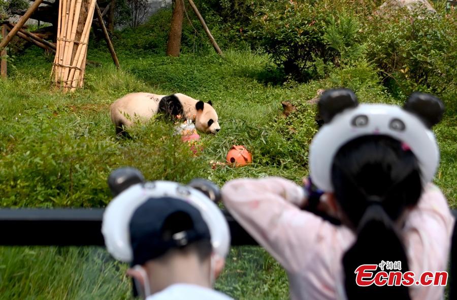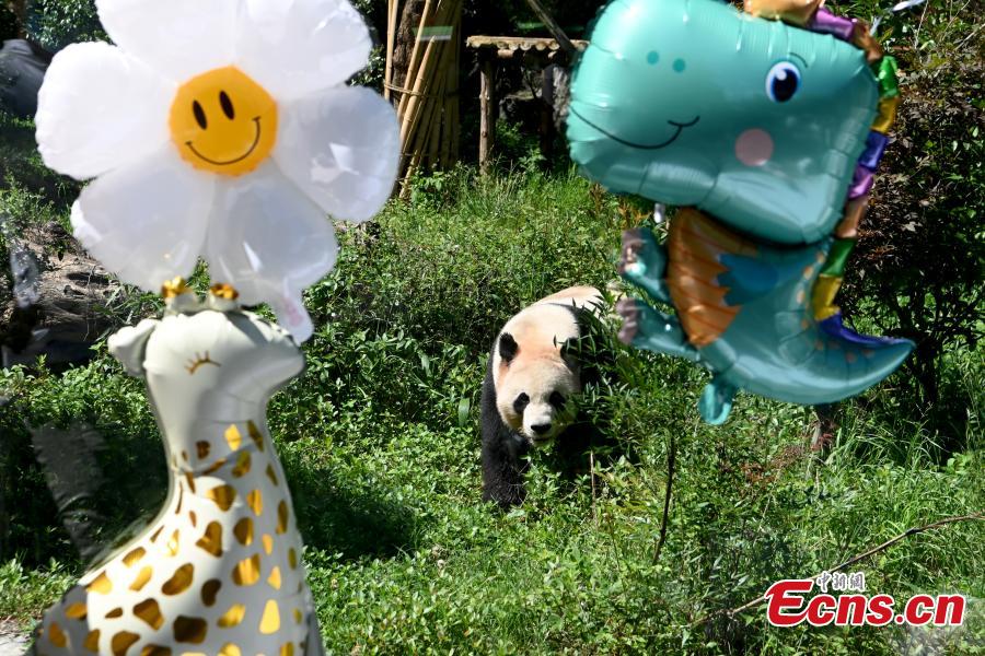 Giant panda Mao Zhu plays at Yunnan Wild Animal Park in Kunming, southwest China's Yunnan Province, July 26, 2022. Yunnan park held a birthday party for Mao Zhu on Tuesday. (Photo: China News Service/Li Jiaxian)