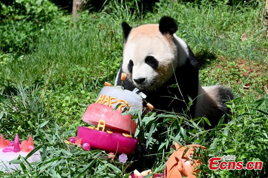Giant panda Mao Zhu enjoys its special birthday cake made with ice and fruit at Yunnan Wild Animal Park in Kunming, southwest China's Yunnan Province, July 26, 2022. Yunnan park held a birthday party for Mao Zhu on Tuesday. (Photo: China News Service/Li Jiaxian)