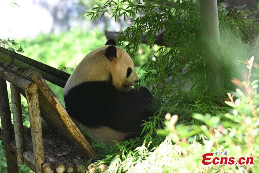 Giant panda Mao Zhu eats bamboo at Yunnan Wild Animal Park in Kunming, southwest China's Yunnan Province, July 26, 2022. Yunnan park held a birthday party for Mao Zhu on Tuesday. (Photo: China News Service/Li Jiaxian)