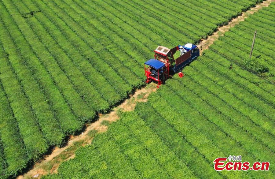 A tea harvester works at a tea plantation in Taihe county of Ji'an city, east China's Jiangxi Province, July 25, 2022. Jiangxi has seen mechanized tea harvesting in recent years. (Photo: China News Service/Deng Heping)