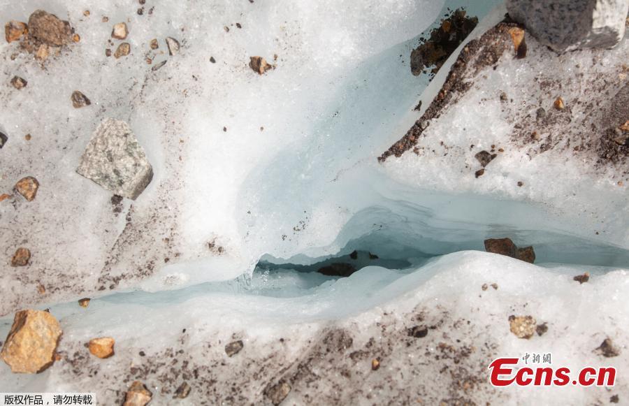 Melt water flows into an ice crevice at the Pers Glacier near the Alpine resort of Pontresina, Switzerland July 22, 2022. (Photo/Agencies)