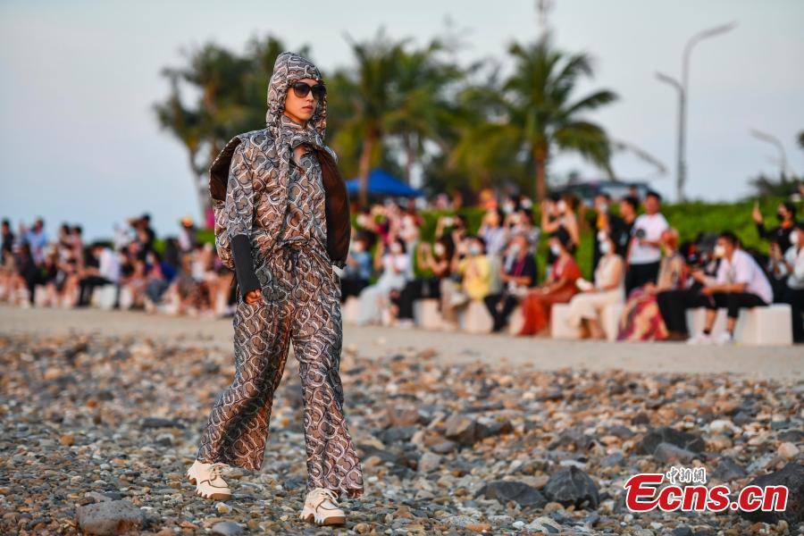A model walks on the beach during DAMOWANG Autum/Winter 2022 collection fashion show at the 2nd China International Consumer Products Expo in Haikou, south China's Hainan Province, July 27, 2022. (Photo: China News Service/Luo Yunfei)