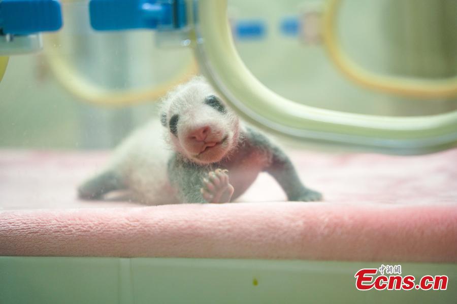 A new-born giant panda cub, less than 3-month-old, sleeps in an incubator at Chengdu Research Base of Giant Panda Breeding in northwest China's Sichuan Province, July 28, 2022. (Photo/VCG)
