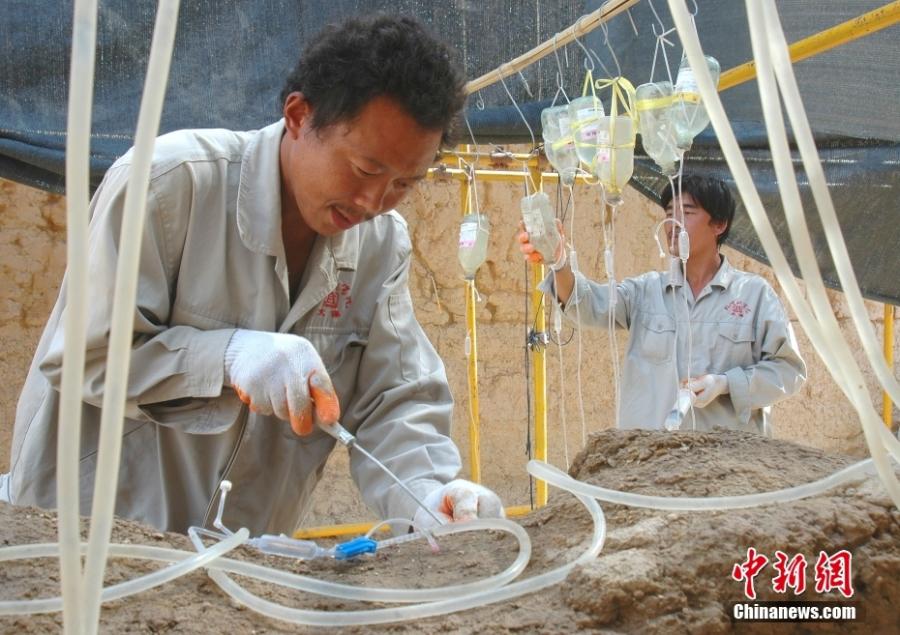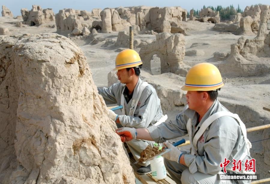 The cultural relics protection technicians of the Dunhuang Academy is doing rescue and reinforcement work on Jiaohe Ruins. (Photo: China News Service/Liu Jian)