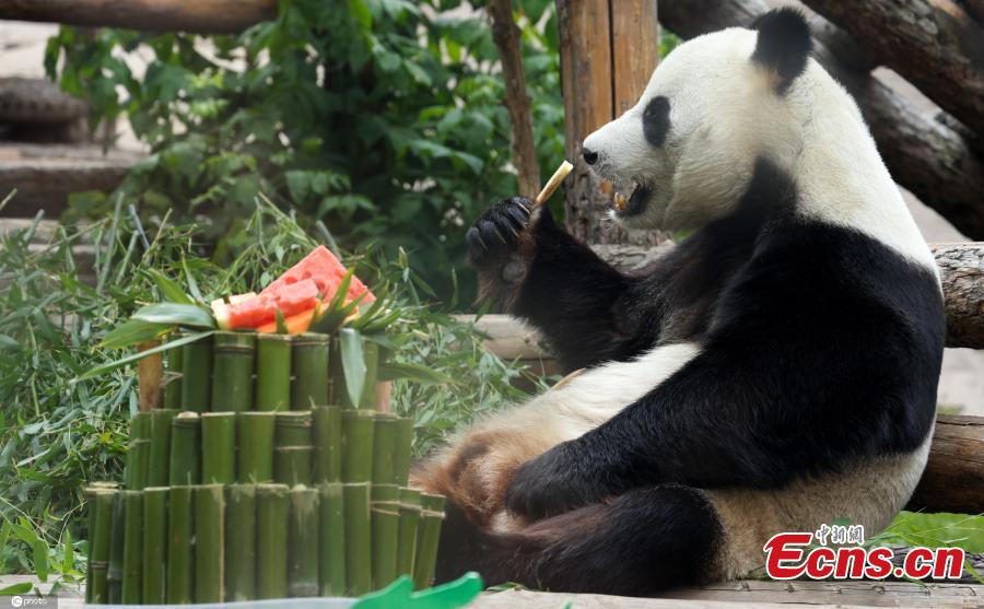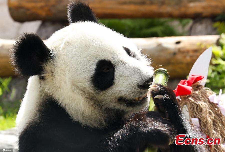 A giant panda enjoys bamboo at the Moscow Zoo, Moscow, Russia, July 31, 2022. The Moscow Zoo celebrated the birthdays of two giant pandas Ding Ding and Ru Yi. Six-year-old male Ru Yi was born on July 31, 2016 whereas five-year-old female Ding Ding was born on July 30, 2017. The pair arrived in Moscow in 2019 for a 15-year joint research program. (Photo/ICphoto)
