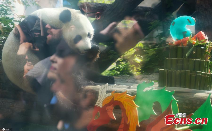 A giant panda plays at the Moscow Zoo, Moscow, Russia, July 31, 2022. The Moscow Zoo celebrated the birthdays of two giant pandas Ding Ding and Ru Yi. Six-year-old male Ru Yi was born on July 31, 2016 whereas five-year-old female Ding Ding was born on July 30, 2017. The pair arrived in Moscow in 2019 for a 15-year joint research program. (Photo/ICphoto)