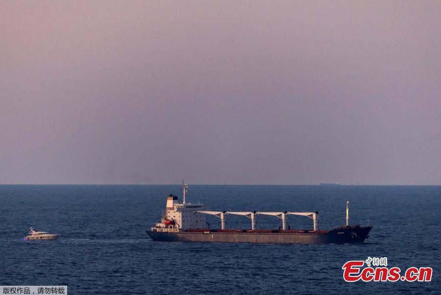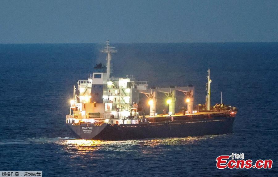 The Sierra Leone-flagged cargo ship "Razoni" loaded with 26,000 metric tons of Ukrainian corn arrives at the northern entrance of the Bosphorus strait for inspection in Istanbul, Turkey, Aug. 2, 2022. (Photo/Agencies)
