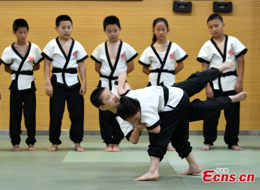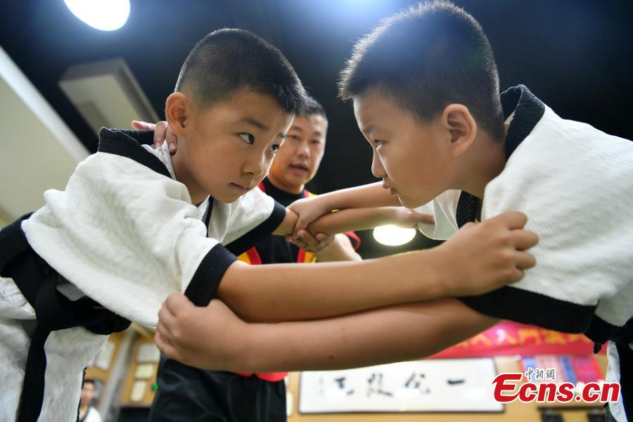 Teenagers practice Kungfu wrestling during the summer break at a training center in Shijiazhuang, north China's Hebei Province, Aug. 3, 2022. The Yang style Kungfu westling was founded in 1937 and included in the eighth batch of intangible cultural heritage list of Shijiazhuang in 2020. (Photo: China News Service/Zhai Yujia)