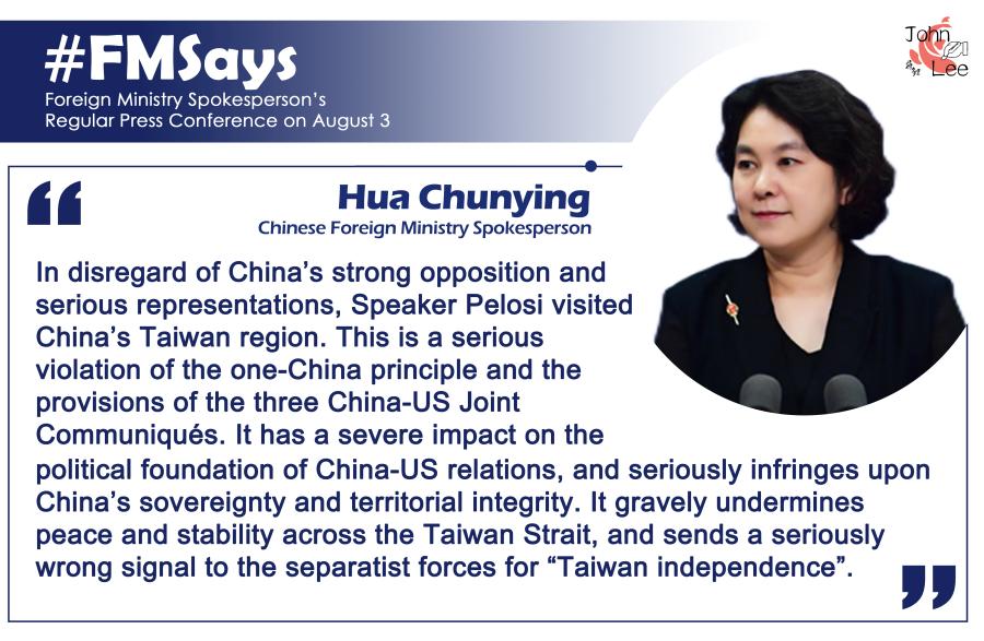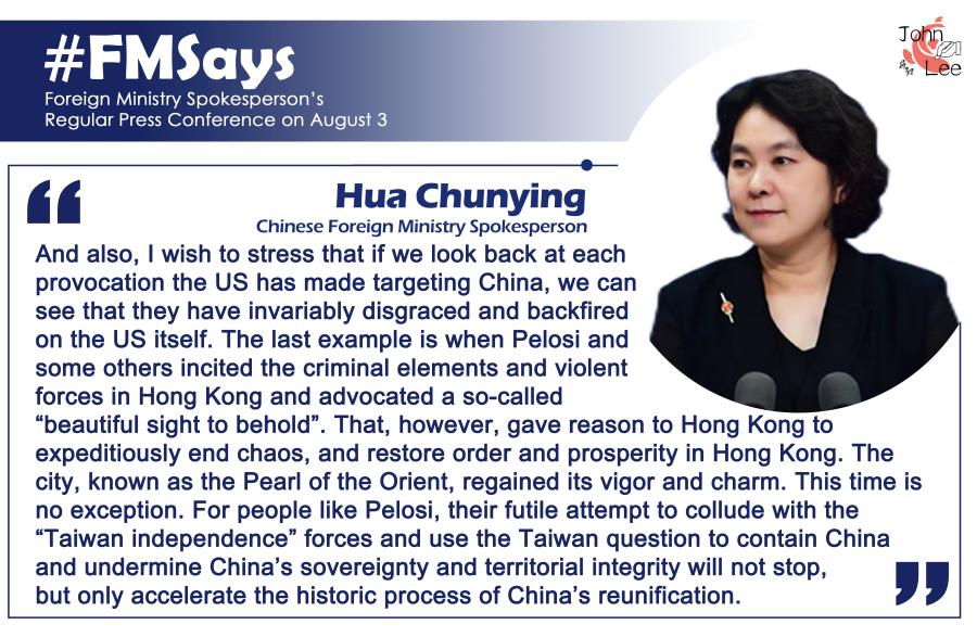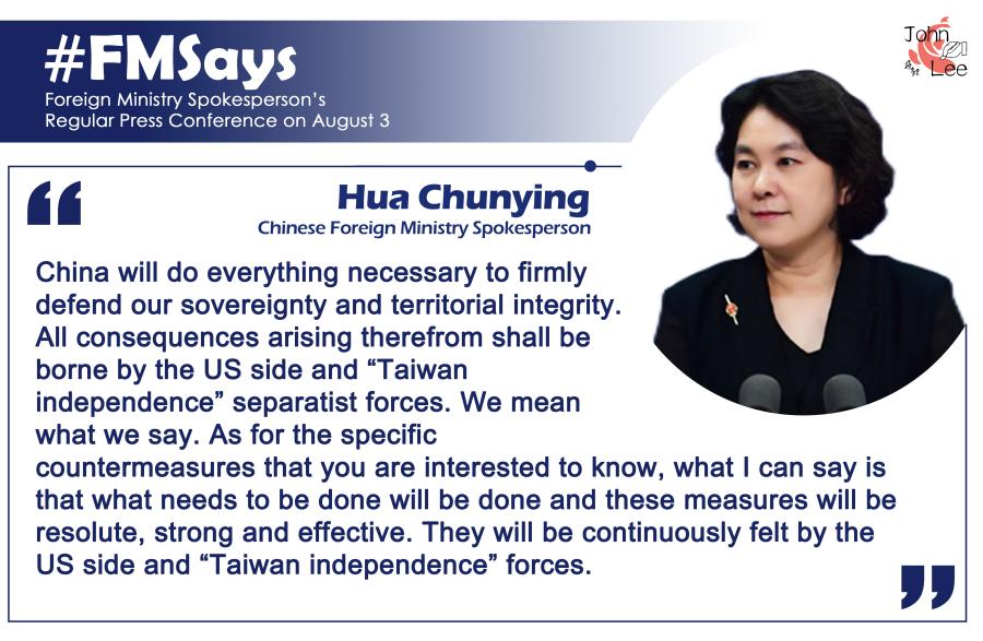 China's countermeasures against Speaker of the U.S. House of Representatives Nancy Pelosi's visit to Taiwan will be resolute, strong, and effective, a Chinese Foreign Ministry spokesperson said on Wednesday.