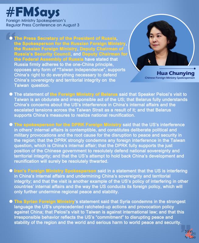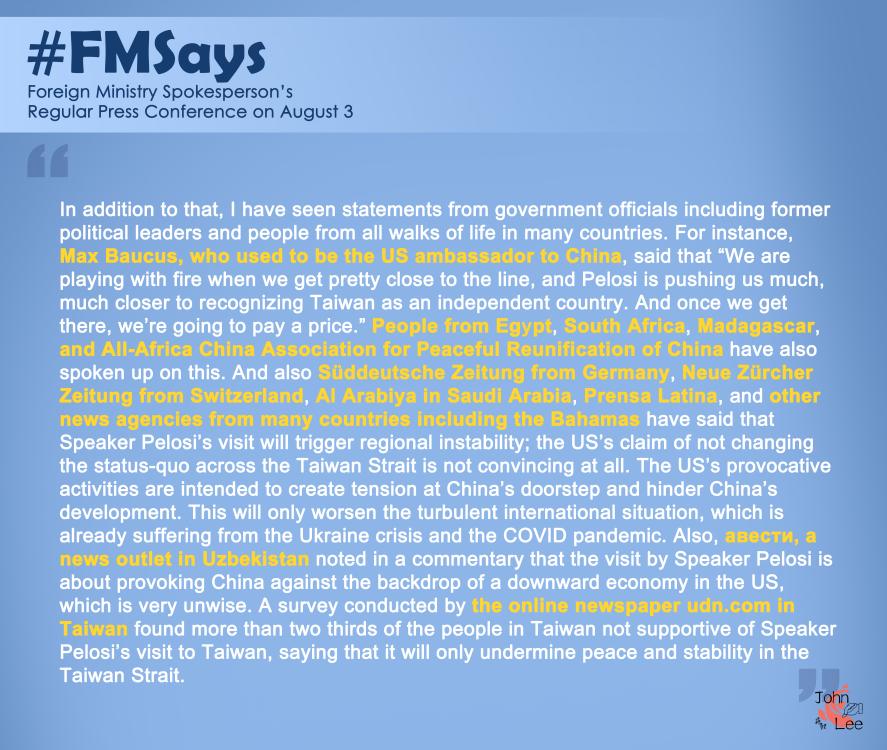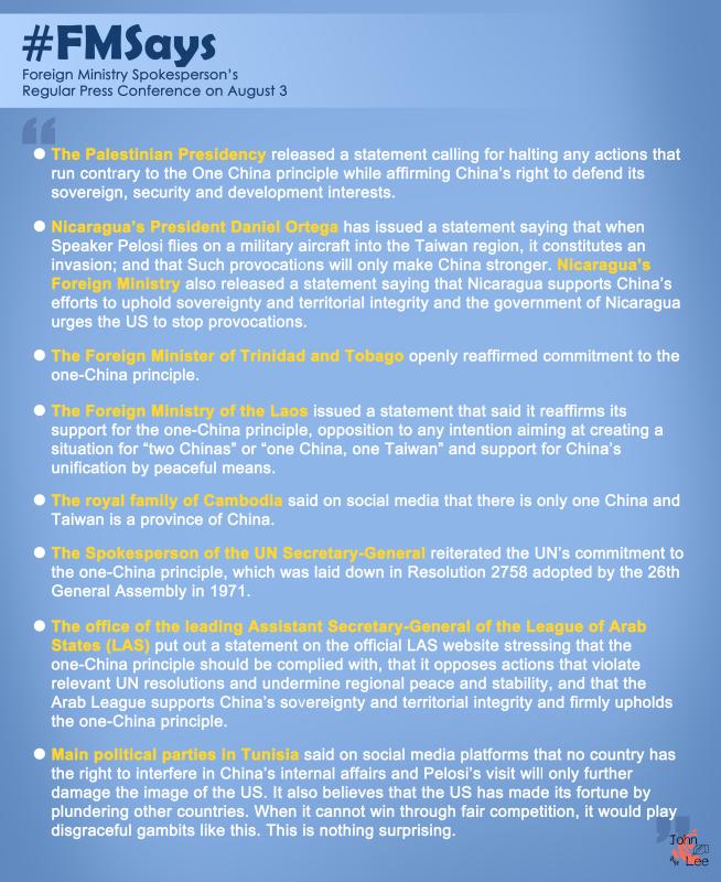 Following the visit by Speaker Pelosi to the Taiwan region, within less than one day, people of different ranks and backgrounds from more than 100 countries and international organizations have spoken up in various ways to condemn her wrong, foolish and insane decision and express their support for the one-China principle and for China’s legitimate efforts to uphold its sovereignty and territorial integrity. Their voice for justice has truly touched us.