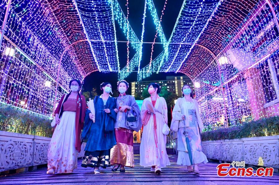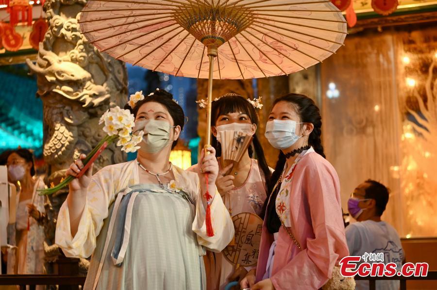 Young women wearing traditional Chinese costumes pose for photos during a celebration for Qixi festival, the Chinese Valentine's Day, at Wong Tai Sin Temple in the Hong Kong Special Administrative Region, Aug. 4, 2022. (Photo: China News Service/Li Zhihua)