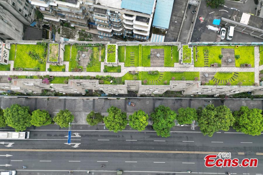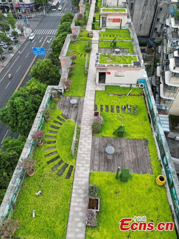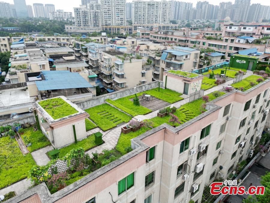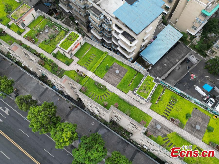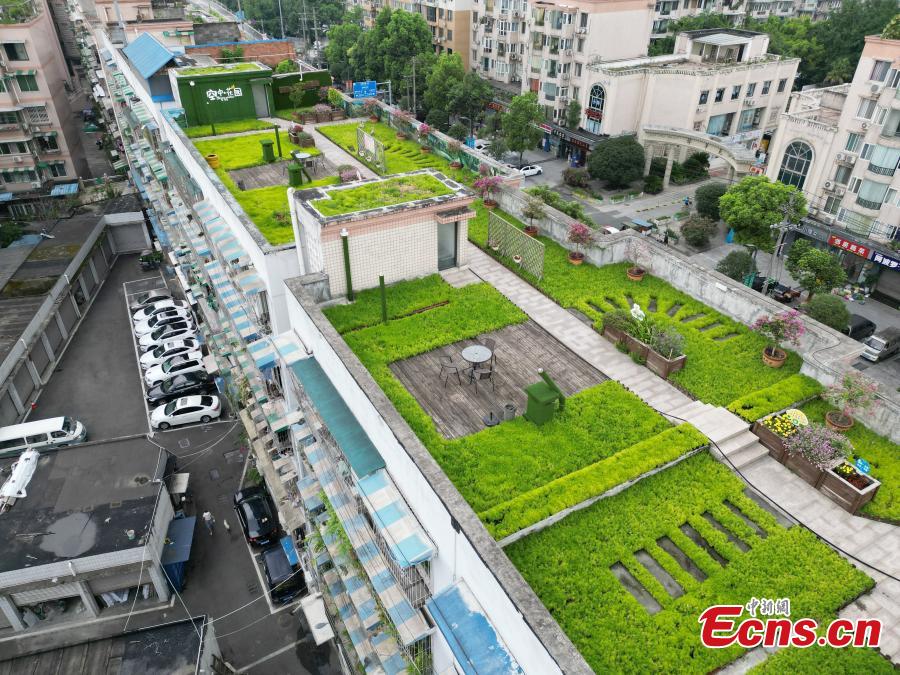A rooftop garden is built atop an old residential building in Chongqing, Aug. 5, 2022. Residents of 60 households demolished the illegal facilities built on the rooftop and transformed it into a 1,100-square meter shared garden. (Photo: China News Service/Zhang Lang)
