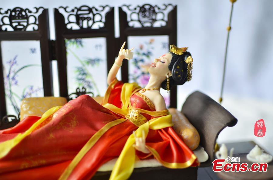 Folk artist He Xiuping makes a dough sculpture of ancient beauty Yang Yuhuan of the Tang Dynasty (618-907), in Renqiu, north China's Hebei Province, Aug. 4, 2022. (Photo: China News Service/Zhang Xuelei)