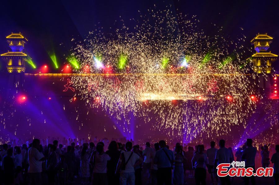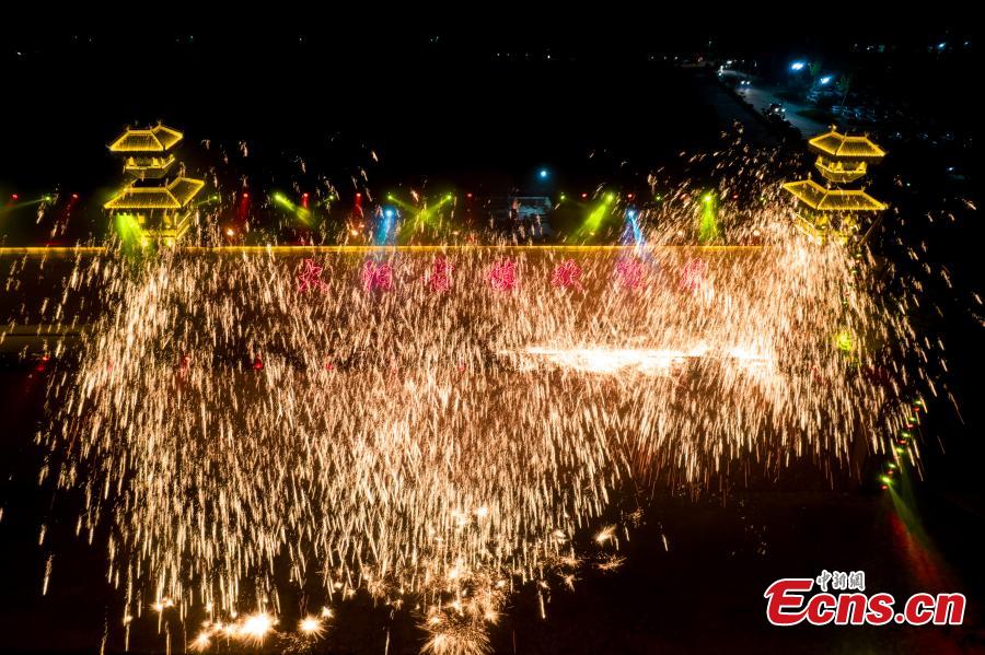 People perform molten iron splashing, a national intangible cultural heritage, during an electronic music festival in Zezhou county of Jincheng city, north China's Shanxi Province, Aug. 11, 2022. (Photo: China News Service/Wei Liang)