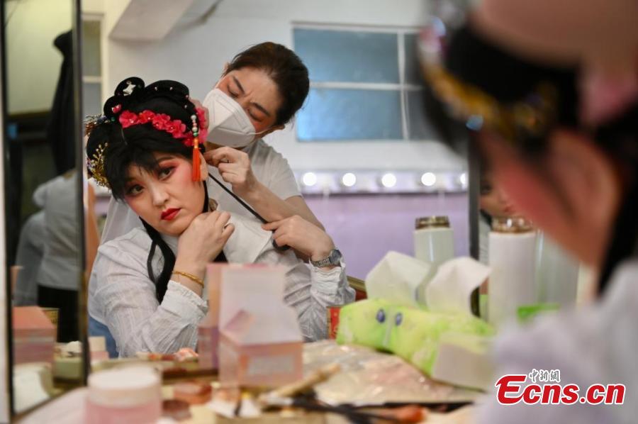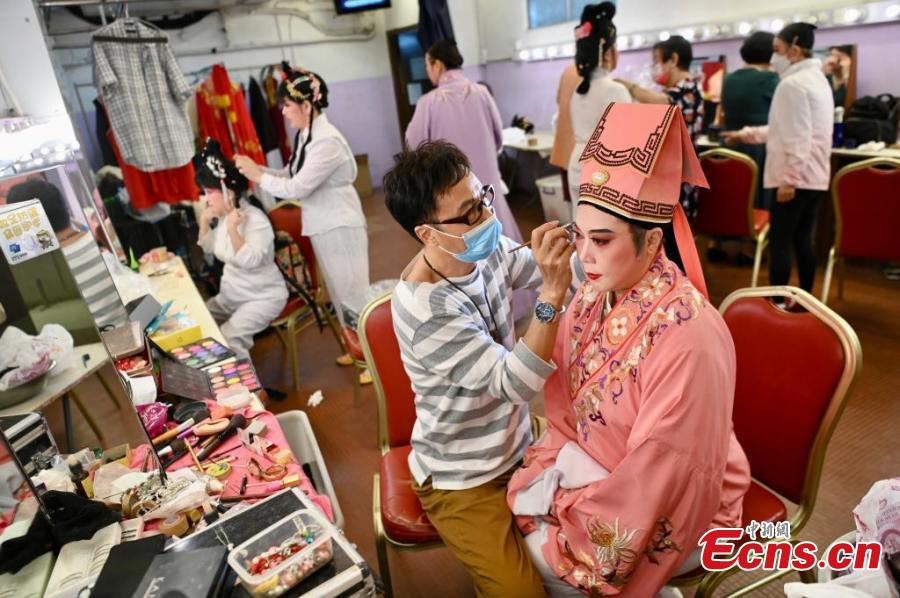 Artists apply makeup backstage before the performance in the Hong Kong Special Administrative Region. (Photo: China News Service/Li Zhihua)