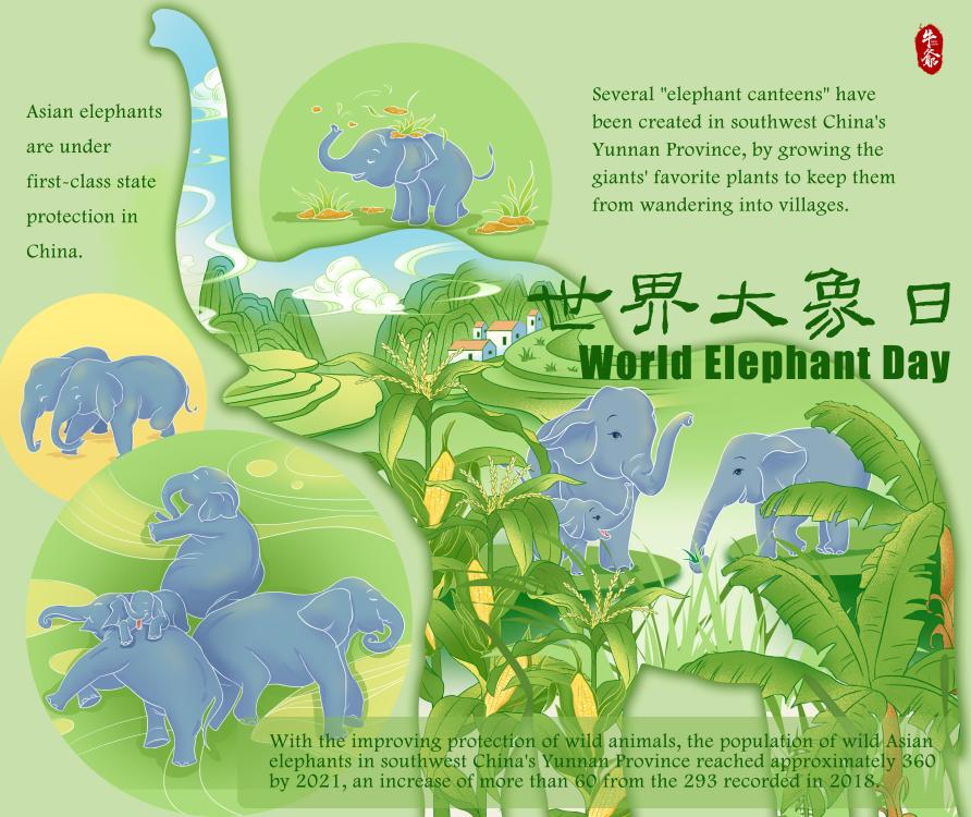 With the improving protection of wild animals, the population of wild Asian elephants in southwest China's Yunnan Province reached approximately 360 by 2021, an increase of more than 60 from the 293 recorded in 2018.