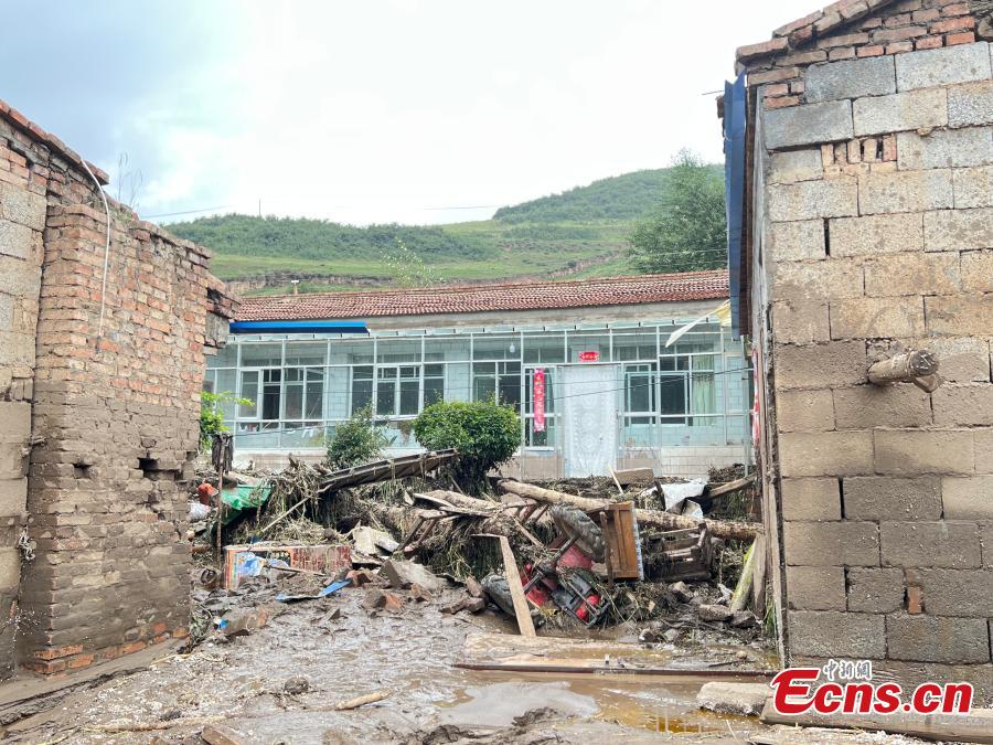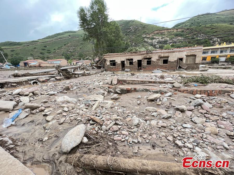 Photo shows damaged roads and houses after a mountain torrent disaster triggered by heavy rain in northwest China's Qinghai Province, Aug. 18, 2022. At least 16 people were dead, with another 36 still missing on Thursday. (Photo: China News Service/Ma Mingyan)