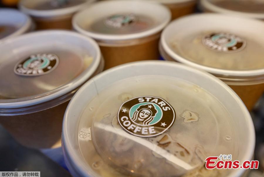 The branded cups are seen at the launching of the new coffee shop "Stars Coffee", which opens following Starbucks Corp company's exit from the Russian market, in Moscow, Russia Aug. 18, 2022. (Photo/Agencies)
