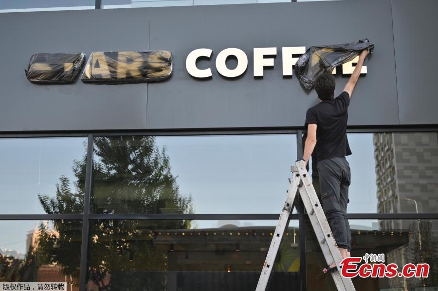 A staff removes cover from a sign of the new coffee shop "Stars Coffee", which opens following Starbucks Corp company's exit from the Russian market, in Moscow, Russia, Aug. 18, 2022. (Photo/Agencies)