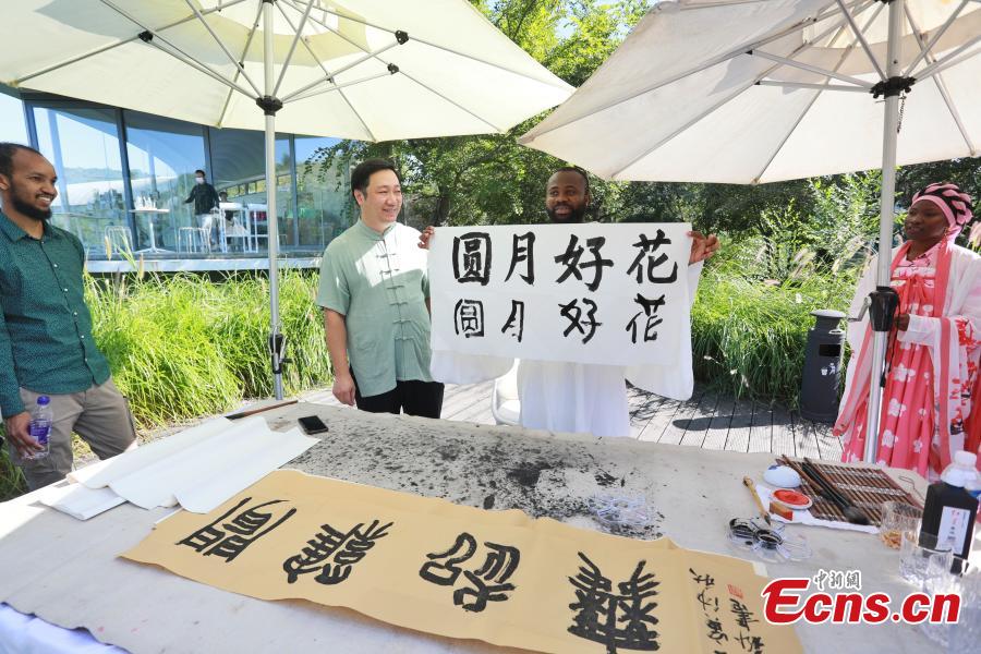 Foreigners try Chinese calligraphy during a themed activities held in Tai'an, east China's Shandong Province, Sept. 7, 2022. (Photo: China News Service/Chen Yang)