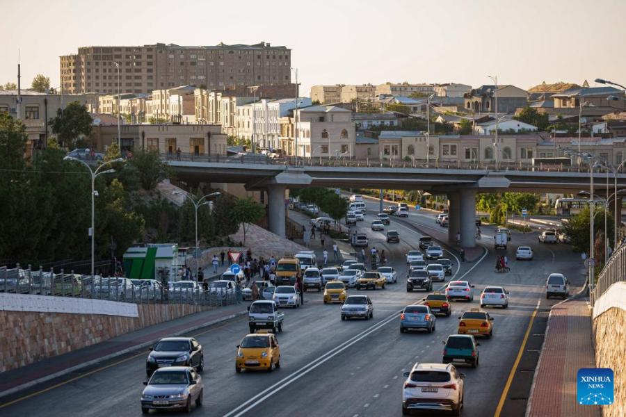 Vehicles run on a street in Samarkand, Uzbekistan, Sept. 3, 2022. Samarkand is the second largest city of Uzbekistan. It is an ancient city on the Silk Road and a melting port of the world's cultures. (Xinhua)