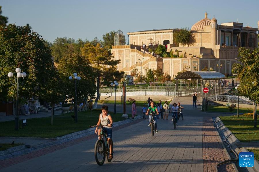 People ride bicycles in Samarkand, Uzbekistan, Sept. 3, 2022. Samarkand is the second largest city of Uzbekistan. It is an ancient city on the Silk Road and a melting port of the world's cultures. (Xinhua)