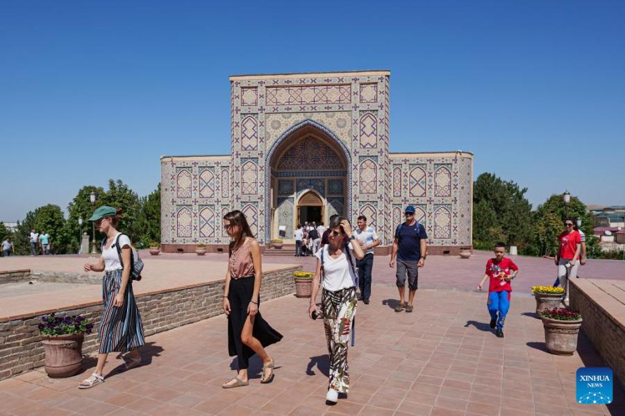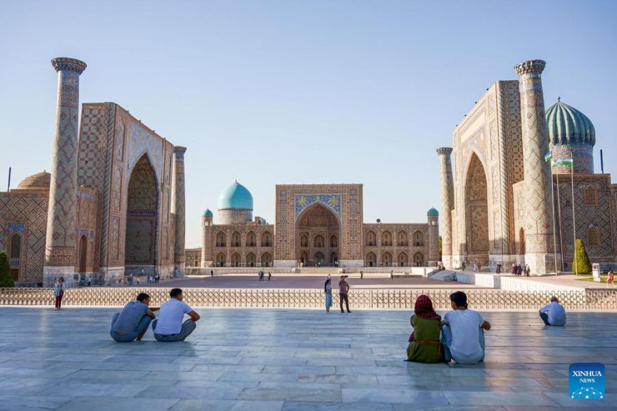People visit the Registan Square in Samarkand, Uzbekistan, Sept. 3, 2022. Samarkand is the second largest city of Uzbekistan. It is an ancient city on the Silk Road and a melting port of the world's cultures. (Xinhua)