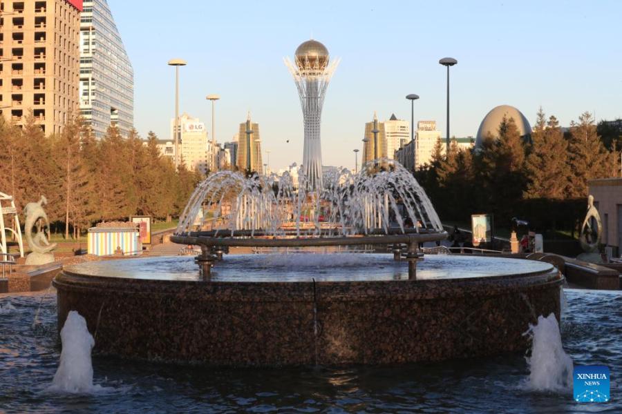 Photo taken on Sept. 9, 2022 shows a fountain with the background of the Baiterek Tower, a landmark tourist site of Nur-Sultan, Kazakhstan. (Xinhua/Lu Jinbo)