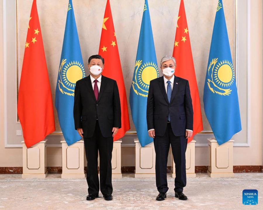 Chinese President Xi Jinping and Kazakh President Kassym-Jomart Tokayev pose for a photo before their formal talks, Sept. 14, 2022. Xi arrived in Nur-Sultan Wednesday afternoon and began his state visit to the Republic of Kazakhstan. (Xinhua/Rao Aimin)