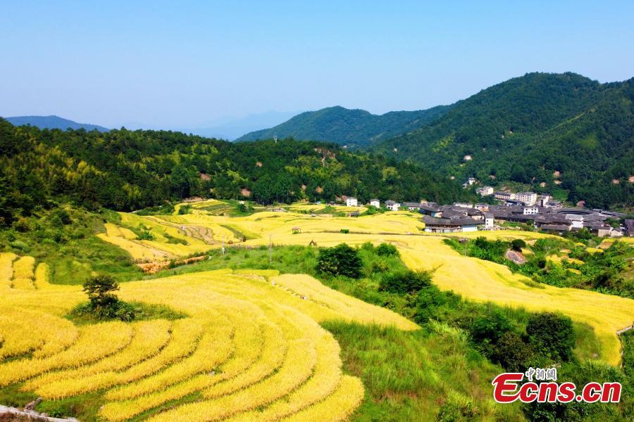 Golden harvest terraced fields and traditional tulou (earth-packed dwellings) form an idyllic scenery in Yongding county, east China's Fujian Province, Sept. 13, 2022. (Photo provided to China News Service)