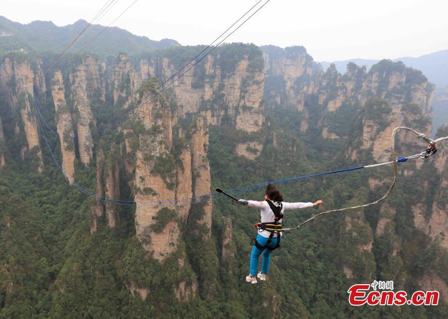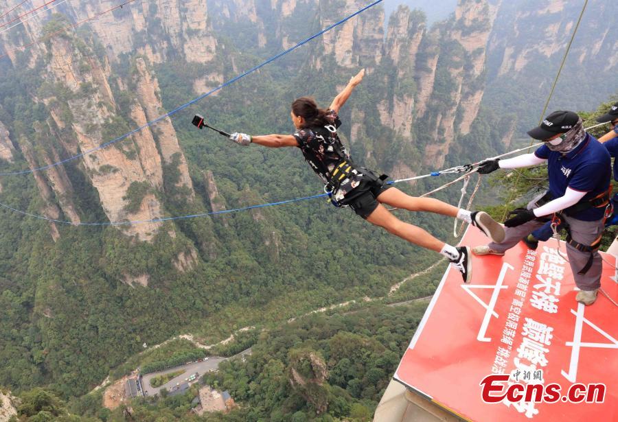 A total of 50 outdoor sports enthusiasts took part in the challenge held at Wulingyuan from Sept.12 - 15, jumping from a cliff with a straight span of 691 meters and a height drop of 335 meters.