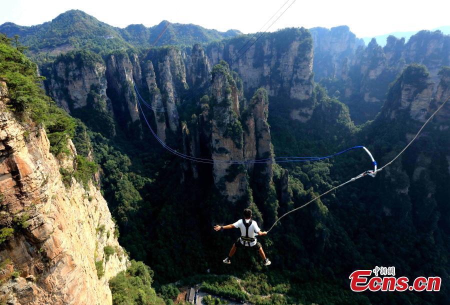 A participant jumps during the first rope swing challenge carnival held at Wulingyuan scenic spot in Zhangjiajie, central China's Hunan Province, Sept. 15, 20. (Photo: China News Service/Wu Yongbing)
