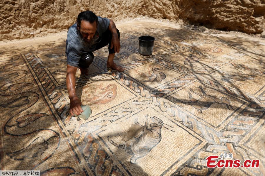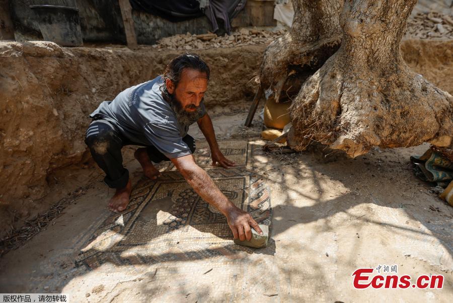 A farmer cleans a mosaic floor he discovered at his farm and which dates back to the Byzantine era in the central Gaza Strip, Sept. 18, 2022. (Photo/Agencies)