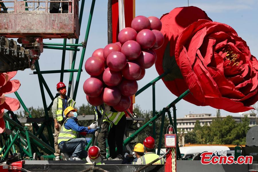 Artificial flowers are being installed at the Tiananmen Square in Beijing, Sept. 19, 2022, to celebrate the upcoming National Day holiday. (Photo: China News Service/Yi Haifei)