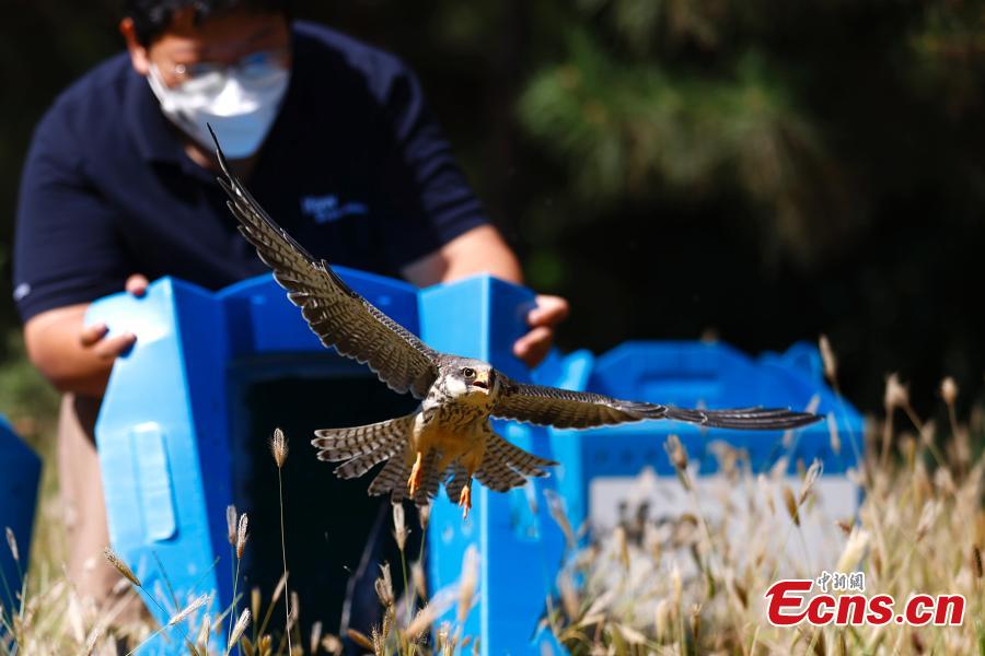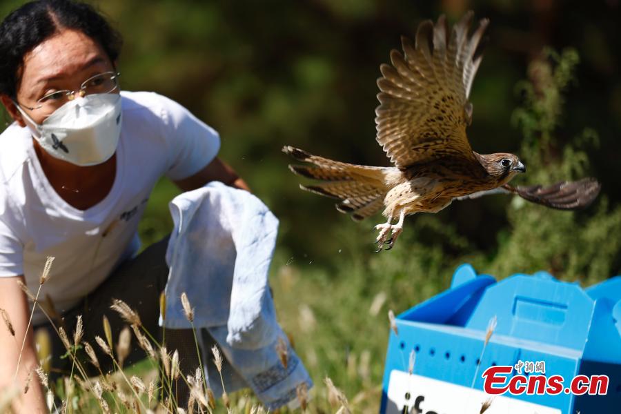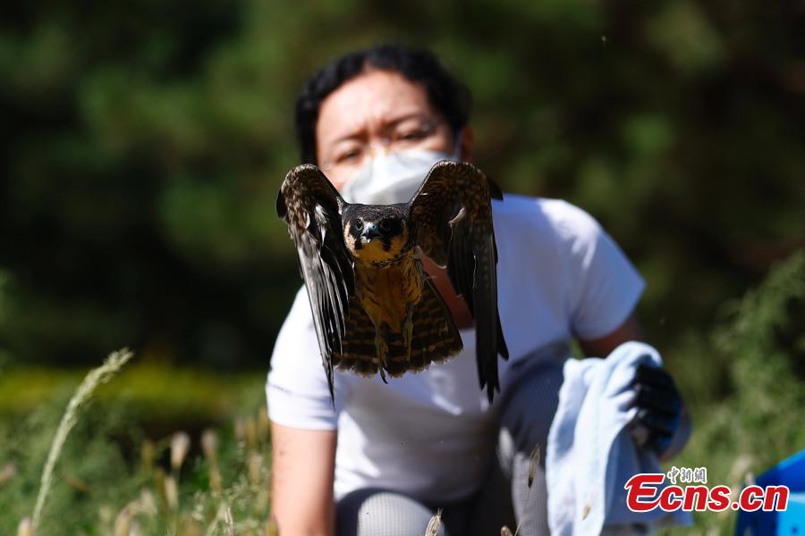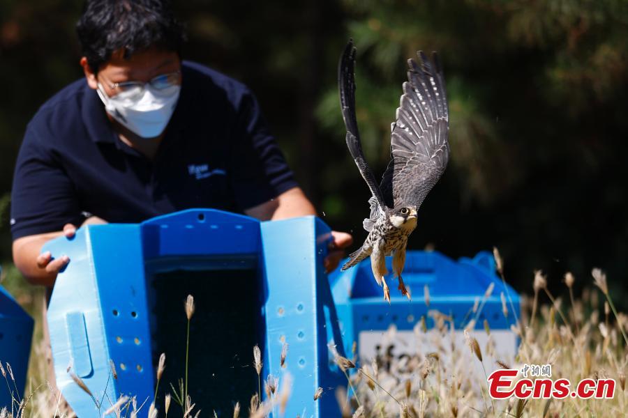 A raptor is released in the suburbs of Beijing, Sept. 19, 2022. Six recovered raptors -- a kestrels, two red-footed falcons and three kestrels -- were released to the wild on Monday. All of them are listed as Class II National protected animals in China. (Photo: China News Service/Fu Tian)