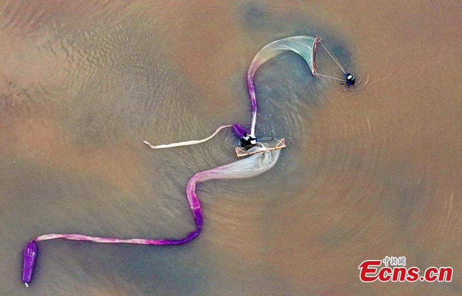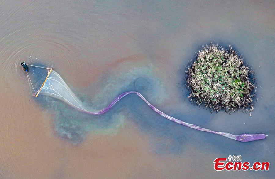 A farmer hauling a 15-20 meters long net harvests brine shrimps in the Salt Lake in Yuncheng, north China's Shanxi Province, Sept. 18, 2022. (Photo provided to China News Service)